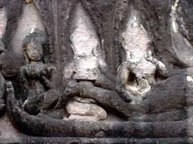 ある先生が言うには,クメール遺跡のレリーフの中に,神様が寝転びながら侍女の乳房を足で弄んでいるものがあるとのことだが,これだろうか.そのように見ればそのように見えなくもないが,そのように見えるだけと言えなくもない.(北側の宮殿) | |