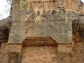 ヤーインガオ(「ンガ」は鼻濁音の「ガ」.以下,煩わしいので単に「ヤーイガオ」と表記)遺跡は,プンポーン遺跡の10kmほど北東,国道24号線から未舗装のわき道へ南に少し入ったところにある.ヤーイガオとは,「ガオ婆さん」という意味.村人たちはしばしば古いものを「〜婆さん」と名前を付けて呼ぶので,これも近くの村人がそう呼び慣わしているものであろう.「ガオ」には,タイ語で「寂しい」を意味する綴りが充ててある.「ガオ」は恐らくもともとはクメール語で,それにタイ語の表記を充てたに過ぎないのであろうが,雑草に覆われ,茂みの中にひっそりと立っている姿は,「寂しい」という語がぴったり来る.観光客などめったに訪れないものと見えて,遺跡を見にきた我々を,近所の子供たちが遠巻きに見物していた. 東向きに煉瓦造りの塔が3棟並ぶ形式のものであるが,北側の塔は既に崩れ去ってしまっており,中央の塔もざっくりと中央が割れて崩れかけ,ワイヤーや角材で支えてある.煉瓦造りであるので,修復するのは難しいのであろう.完全にばらして積み直すしかなさそうだ.そうした場合修復と呼べるのか,再建なのか,模造なのか. しかし,崩れかけてはるものの,建物の表面は,ほとんど風化していない.ほんの数年前に建てたようにも見えるほどである.こうした煉瓦造りの塔を建てる際,昔は漆喰や接着剤の類を一切用いなかったという.煉瓦と煉瓦の間にはほとんど隙間がなく,非常に精巧に組み上げてある.南棟の裏面には,煉瓦の壁面に直接レリーフが施してある.